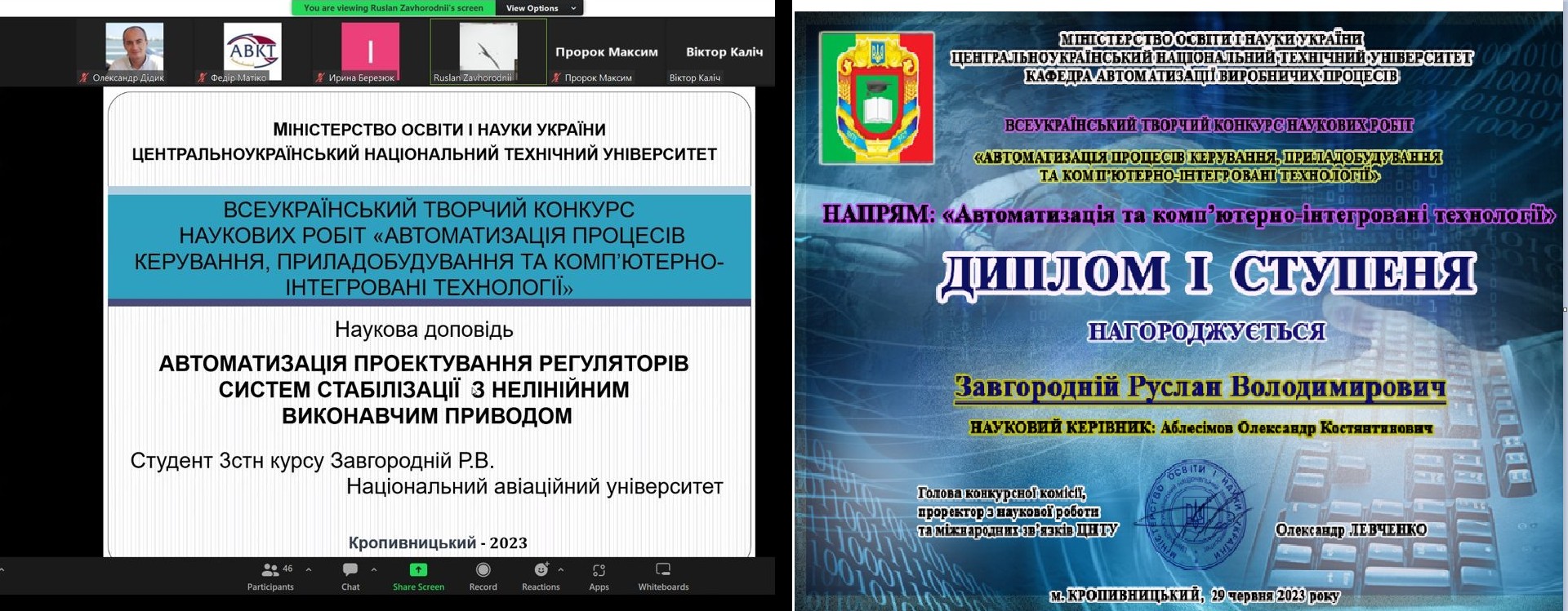 1. «Автоматизація проектування регуляторів систем стабілізації з нелінійним виконавчим приводом», автор – Руслан Завгородній (Національний авіаційний університет), науковий керівник – професор кафедри авіаційних комп'ютерно-інтегрованих комплексів НАУ, к.т.н. Олександр Аблесімов;