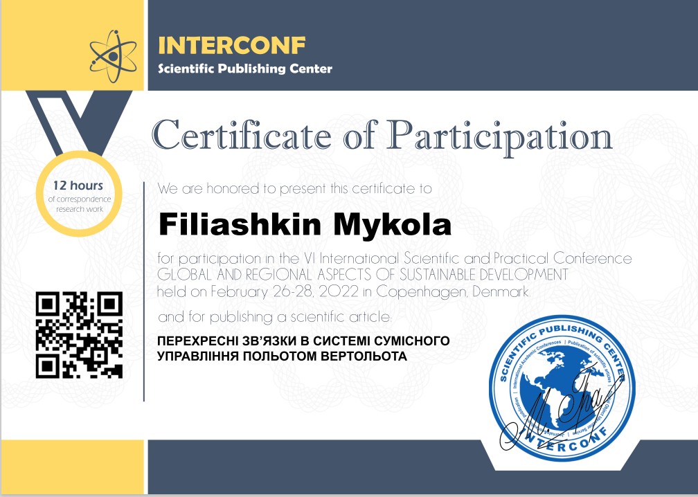 Співробітники кафедри авіаційних компютерно-інтегрованих комплексів приймають активну он-лайн участь у міжнародних науково-практичних конференціях що організовані НИЦ InterConf. InterConf – международная система організацій, що займаються проведенням наукових заходів у всьому світі: в Данії, Франції, Швейцарії, Канаді, США і т.д. Науковий видавничий центр «InterConf» не є окремою організацією, а багатонаціональним представництвом, де кожен офіс має власну редакцію, організаційний комітет, а також затверджений формат проведення заходів.